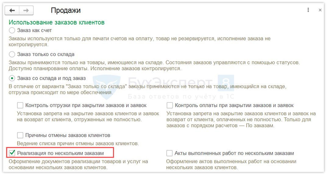 Для включения функциональной опции Реализация по нескольким заказам перейдите в раздел НСИ и администрирование – Продажи – Оптовые продажи – Использование заказов клиентов и установите флажок.