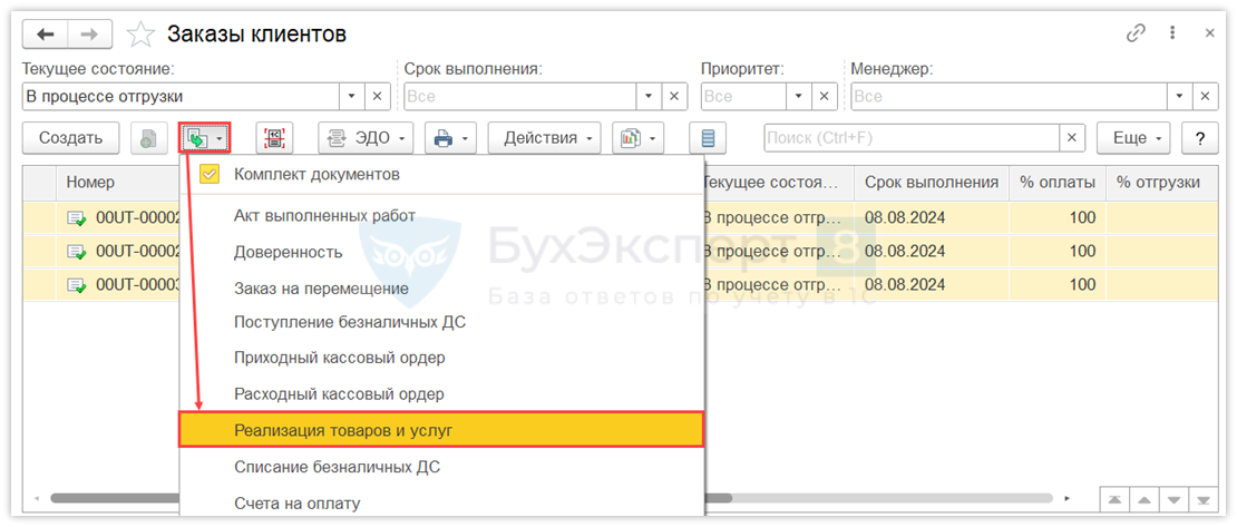Перейдите в раздел Продажи – Заказы клиентов. При помощи клавиши Ctrl выделите необходимые документы, нажмите кнопку Создать на основании и выберите пункт Реализация товаров и услуг.