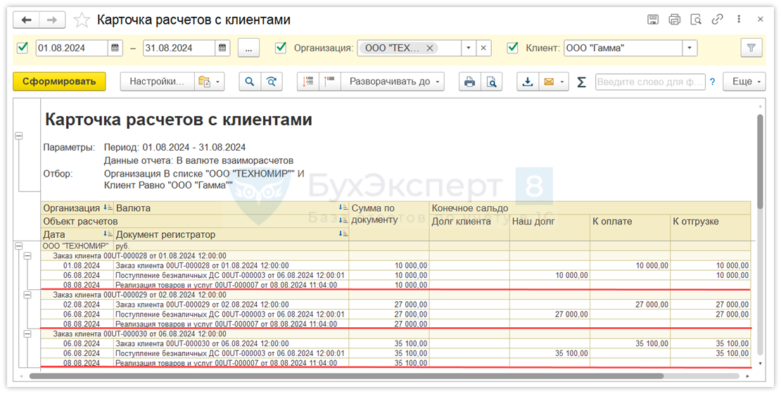 Сводная информация о заказах клиента находится по гиперссылке на вкладке Основное документа Реализация товаров и услуг.