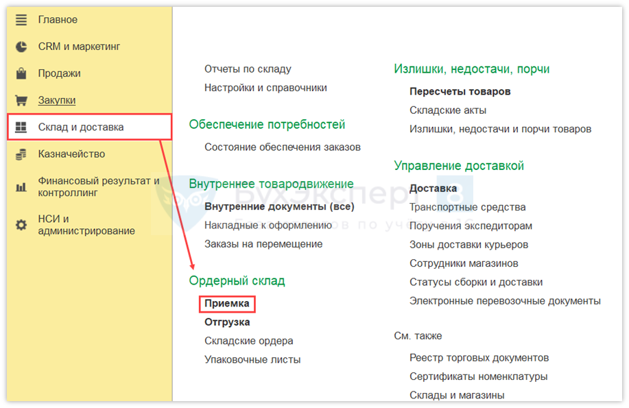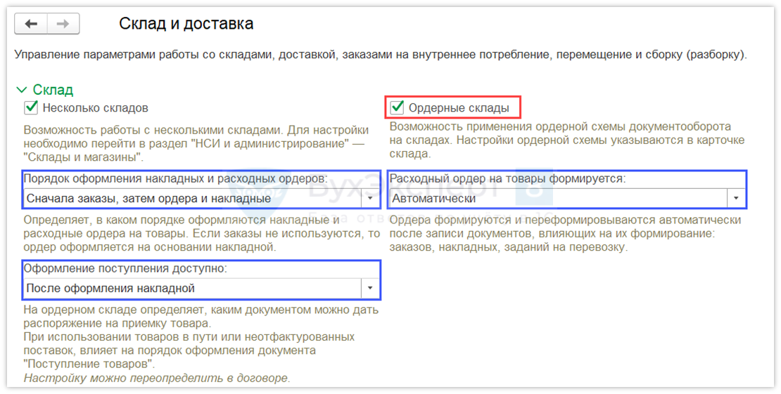 Для начала работы с ордерными складами перейдите в раздел НСИ и администрирование – Склад и доставка и установите флажок Ордерные склады.