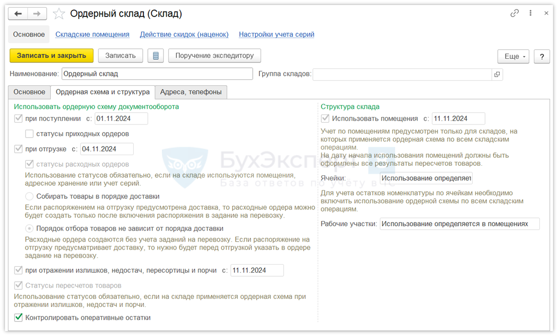 После настройки программы перейдите в раздел НСИ и администрирование – Склады и магазины. В справочнике Склады и магазины нажмите кнопку Создать – Оптовый склад. На вкладке Ордерная схема и структура укажите, при каких операциях используется ордерная схема документооборота и дату начала ведения. Для различных операций дата может быть разной.