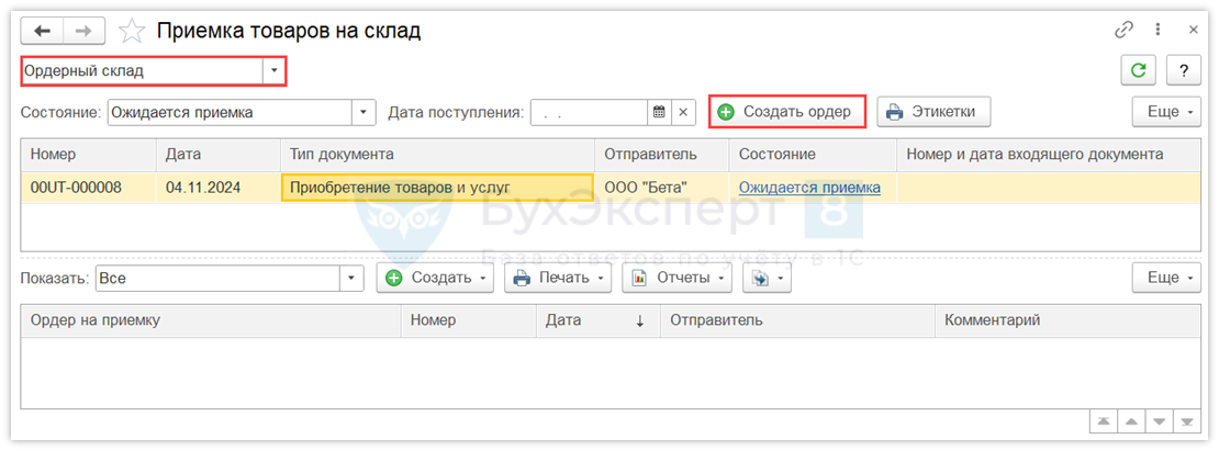 Выберите склад, документ поступления и нажмите кнопку Создать ордер.