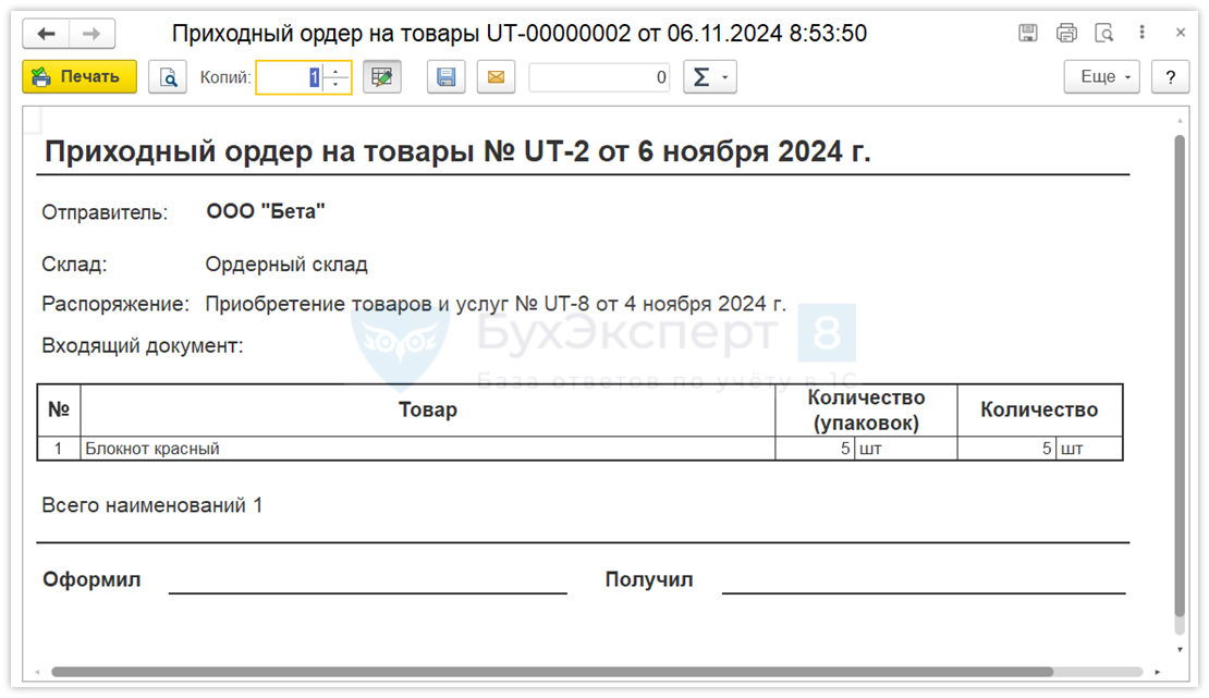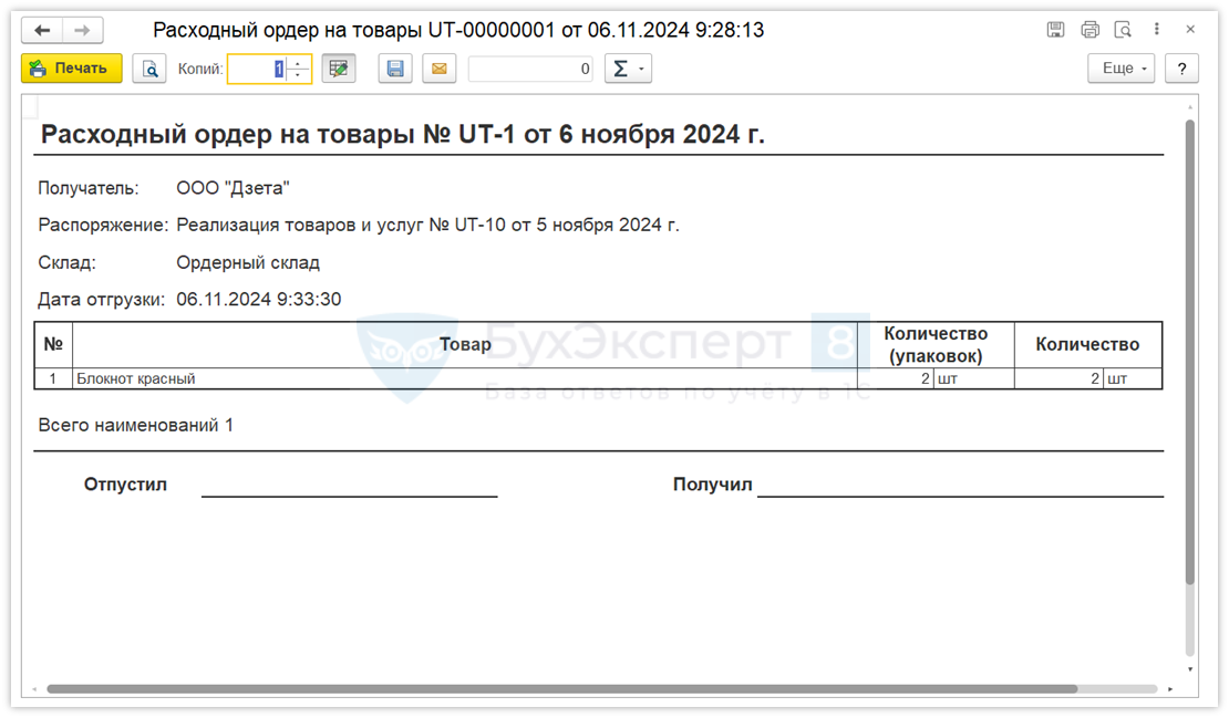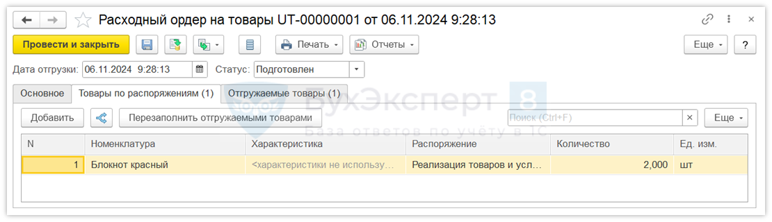 Ордер заполняется данными автоматически из документа Реализация товаров и услуг.