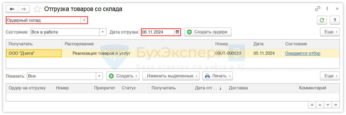 Выберите склад, документ выбытия и нажмите кнопку Создать ордер.