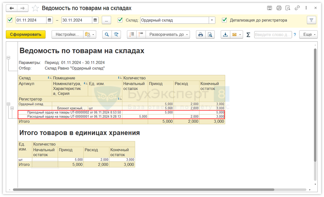 Выполнить контроль операций можно с помощью отчета Ведомость по товарам на складах.