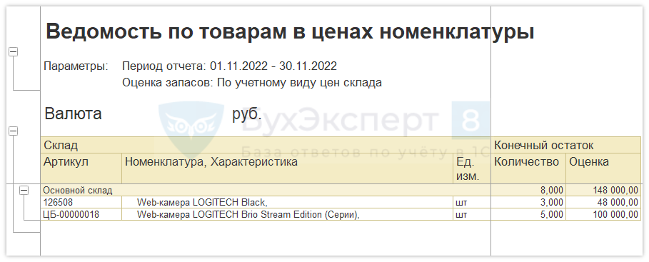 Отчет Ведомость по товарам в ценах номенклатуры