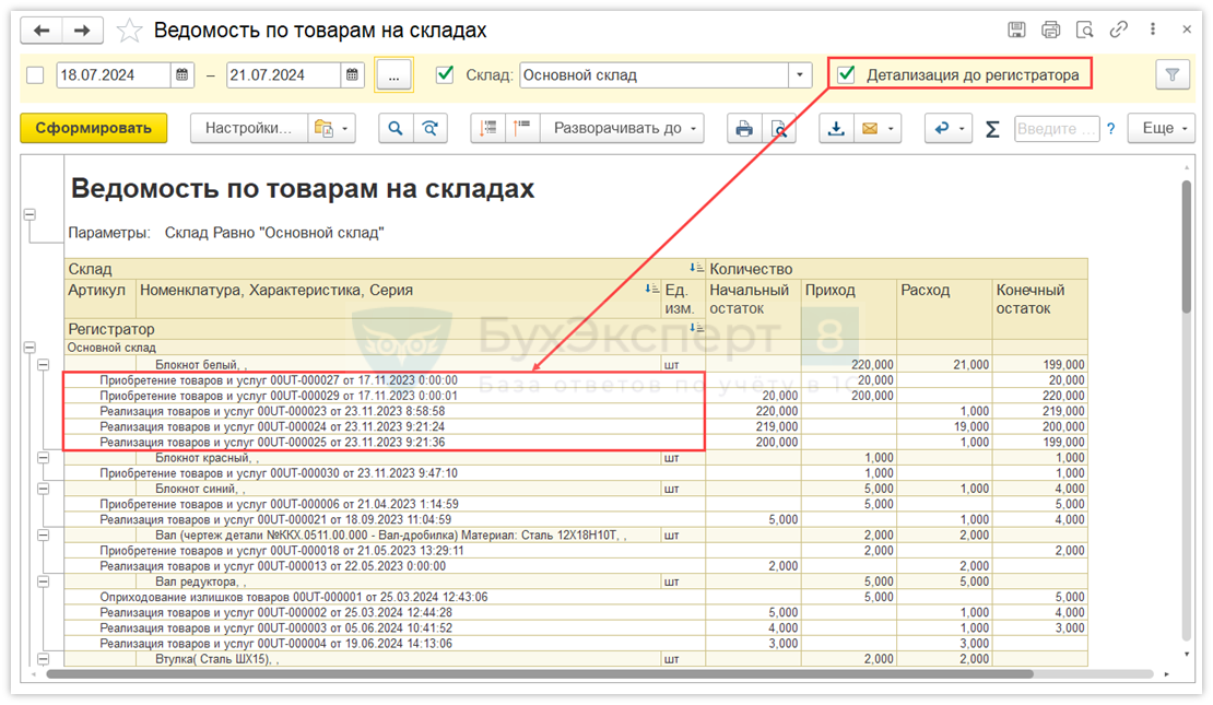 Детализация до регистратора позволяет вывести в отчет информацию о документе движения товарно-материальных ценностей.