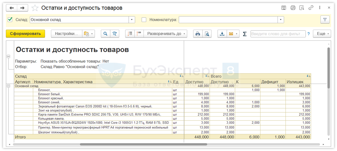 Сформировать отчет можно из раздела Склад и доставка – Отчеты по складу – Остатки и доступность товара.