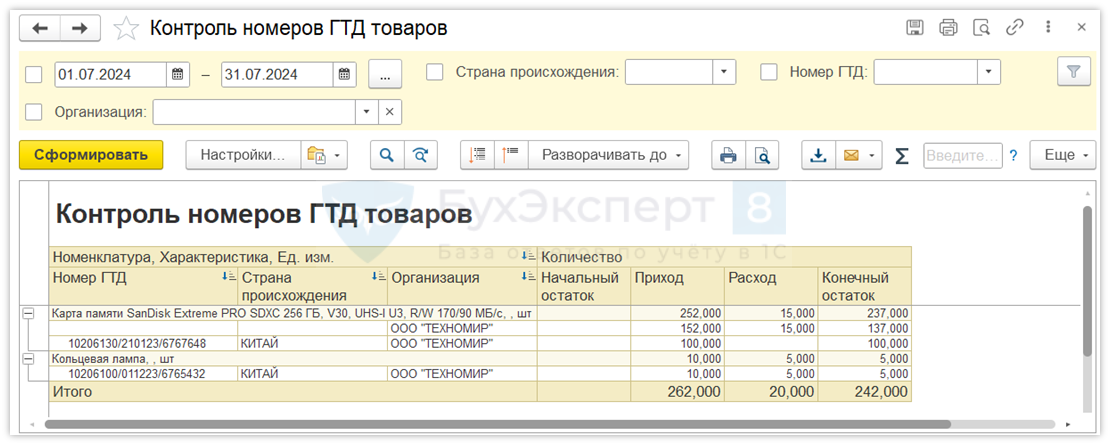 Сформировать отчет можно из раздела Закупки – Отчеты по закупкам – Контроль номеров ГТД.