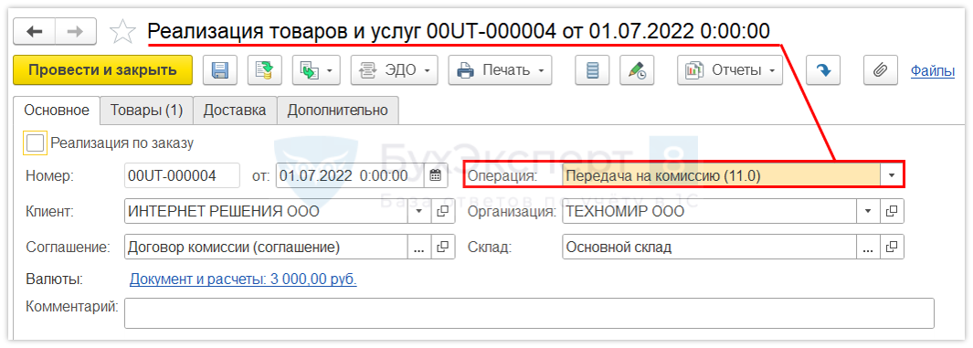 Используем документ Реализация товаров и услуг:
