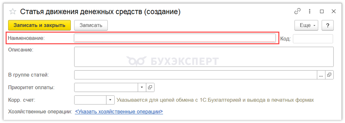Обязательным реквизитом для заполнения является только Наименование. При необходимости можно указать: приоритет оплаты, корр. счет и ограничить список хозяйственных операций, при которых возможно использовать эту статью.