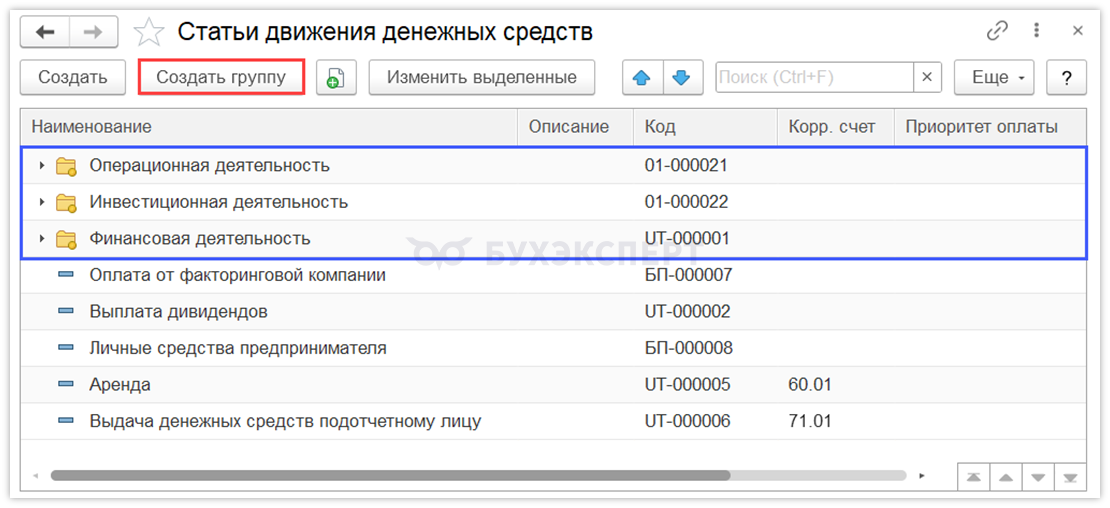 Предусмотрена и группировка Статей ДДС. По умолчанию созданы предопределенные группы, но есть возможность создать собственные статьи либо группы статей.