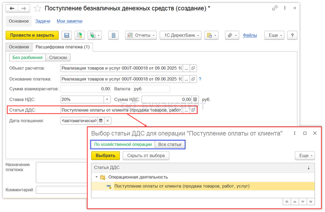 По умолчанию, в документе выбор Статьи ДДС ограничивается хозяйственной операцией. Есть возможность переставить переключатель на значение – Все статьи, чтобы перейти к выбору из полного списка статей или прямо из документа создать новую статью.
