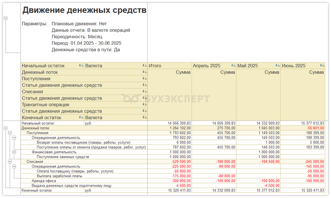 Для постатейного анализа предусмотрен отчет Движение денежных средств. Перейдите в раздел Казначейство – Отчеты по казначейству — Движение денежных средств. Сформируйте отчет.