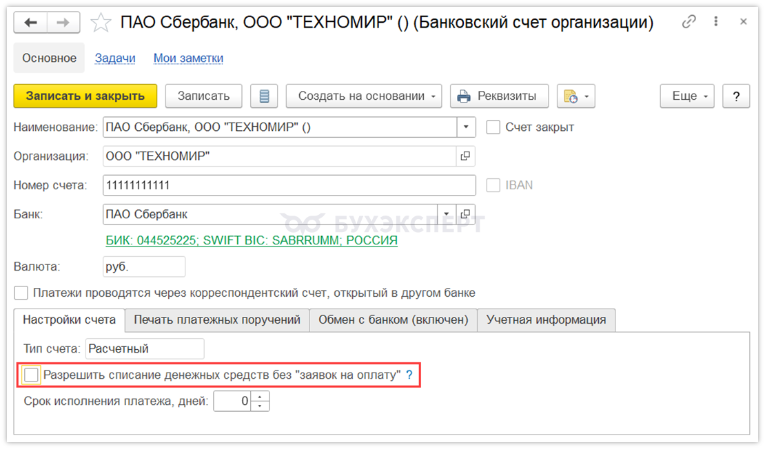 После включения функции, в справочниках Банковские счета организации и Кассы организации появляется дополнительный реквизит Разрешить списание денежных средств без заявок на оплату или Разрешить выдачу денежных средств без заявок на оплату.