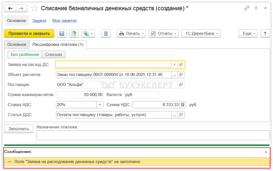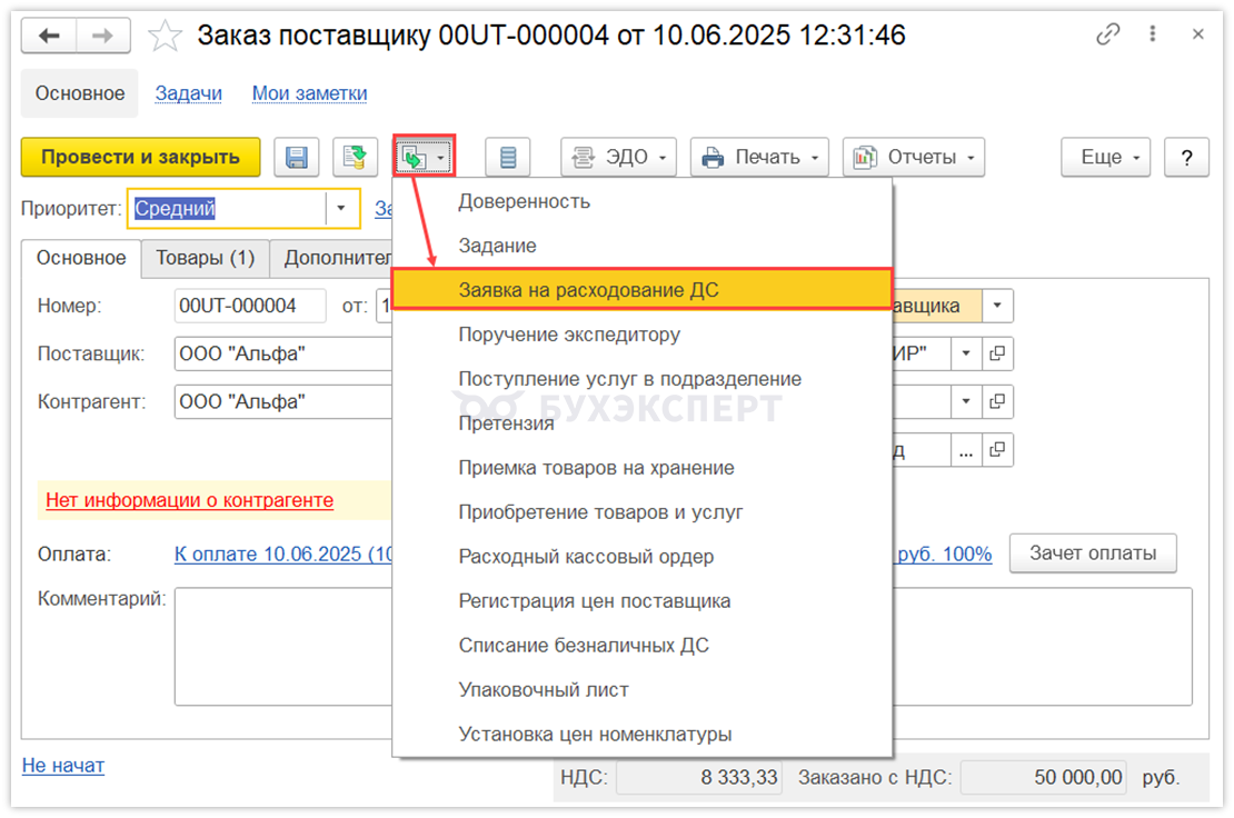 Заявку на расходование ДС можно создать на основании Заказа поставщику напрямую из документа.