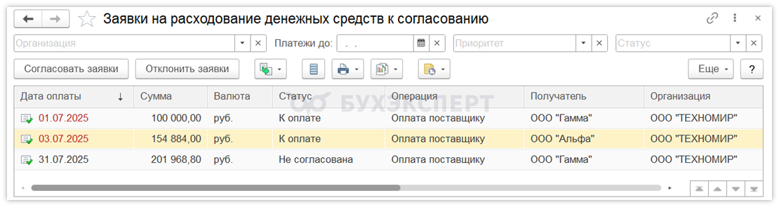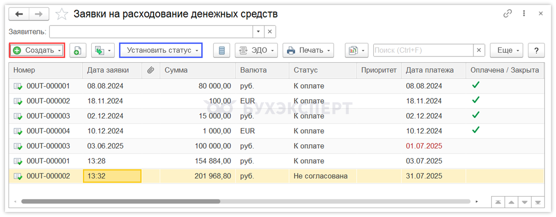 В рабочем месте Заявки на расходование ДС отражены для просмотра и изменения статуса все заявки.