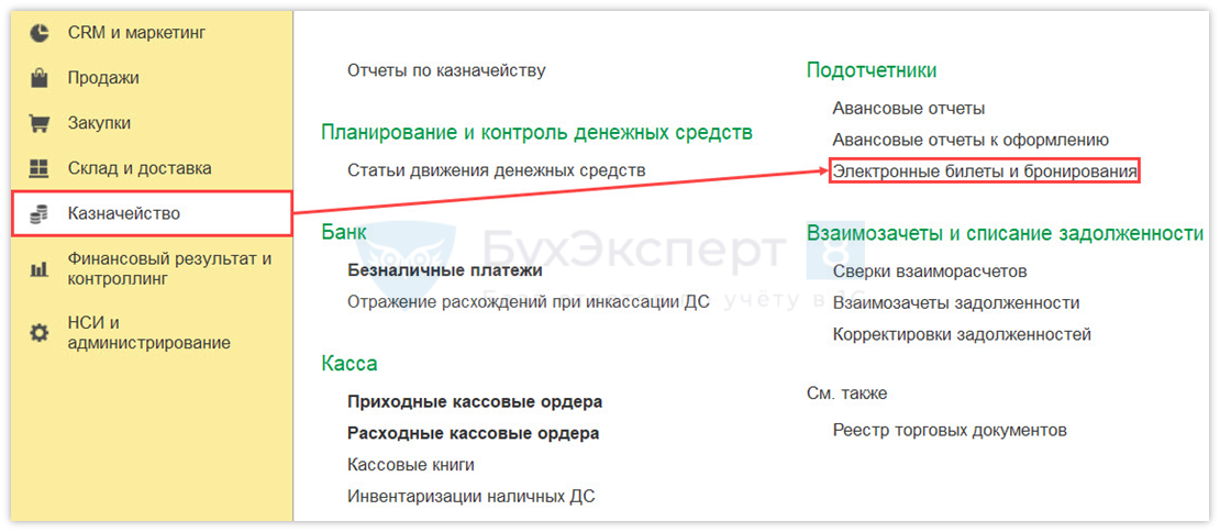 Перейдите в раздел Казначейство — Электронные билеты и бронирования.