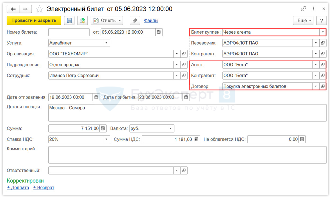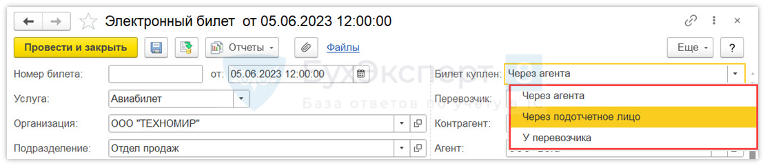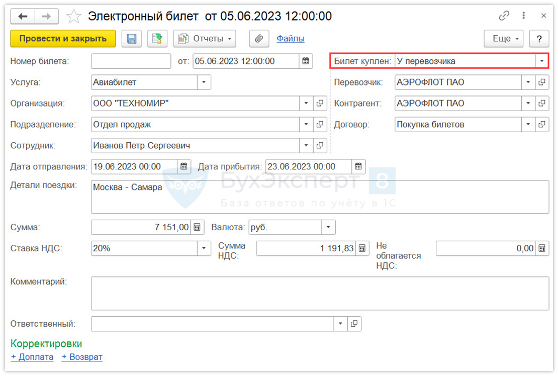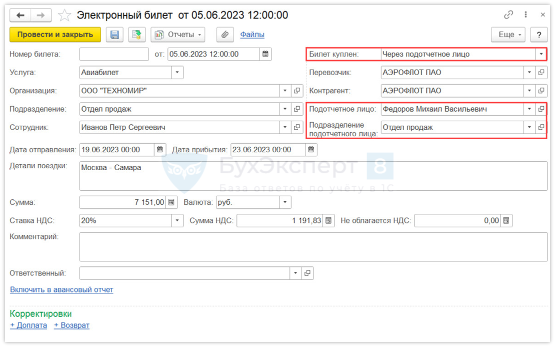 Установите значение Билет куплен – Через подотчетное лицо, заполните данные о подотчетном лице. «Подотчетник» может приобрести билет на любого сотрудника организации.