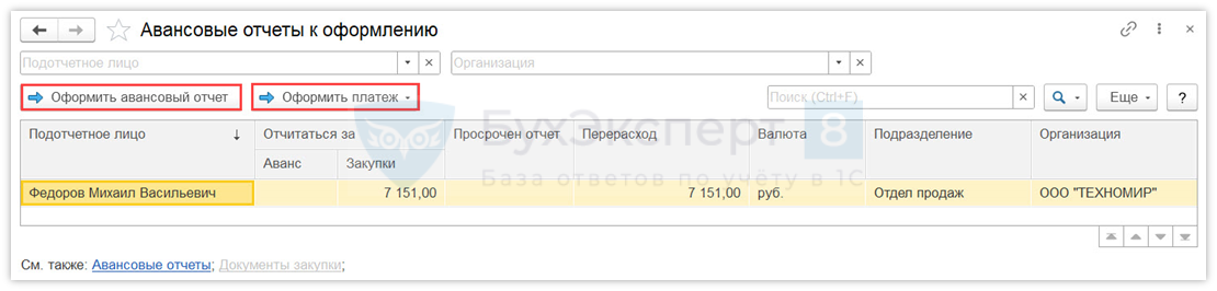 В разделе Казначейство — Авансовые отчеты к оформлению можно сформировать Авансовый отчет на закупку билета (нажать кнопку Оформить авансовый отчет) или возместить подотчетному лицу потраченные средства нажать кнопку Оформить платеж).