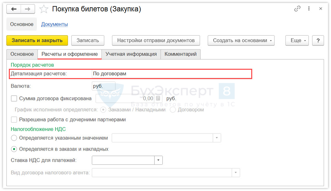 Обратите внимание на договор с компанией-перевозчиком: на вкладке Расчеты и оформление выберите детализацию расчетов По договорам. Договоры с другим видом детализации НЕ будут доступны для выбора в документе Электронный билет.