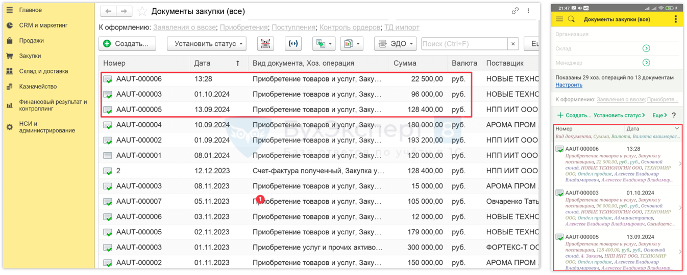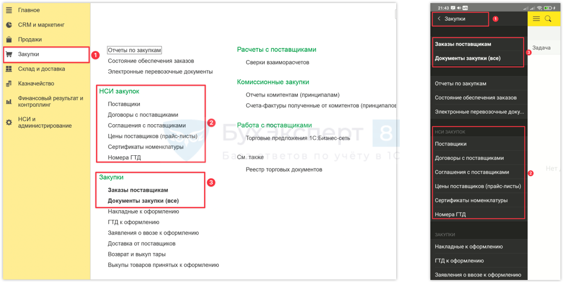 Раздел Закупки в УТ 11 и мобильном клиенте