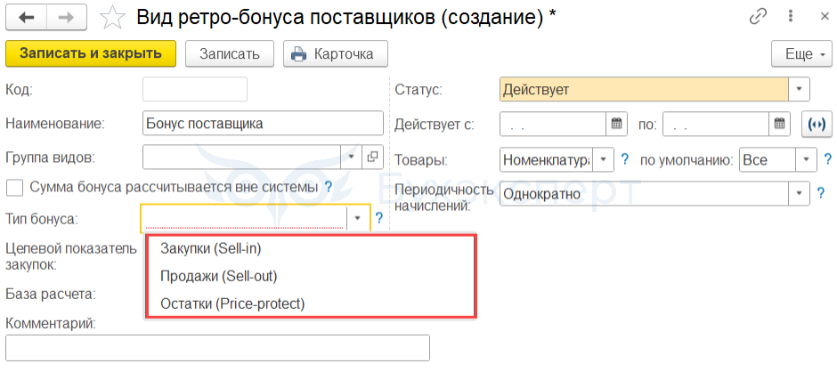 - Закупки (Sell-in) начисляется при условии закупки товара у поставщика. Рассчитывается от объёма закупок.