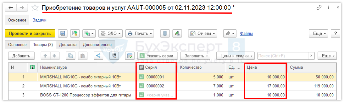 Входящая себестоимость товаров регистрируется документом Приобретение товаров и услуг с указанием конкретных серий.