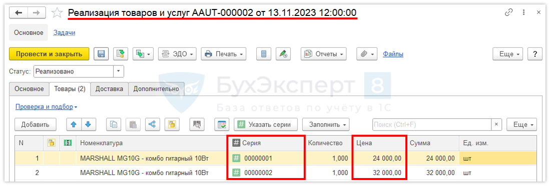 Выбытие товаров регистрируется документом Реализация товаров и услуг с указанием конкретных серий.
