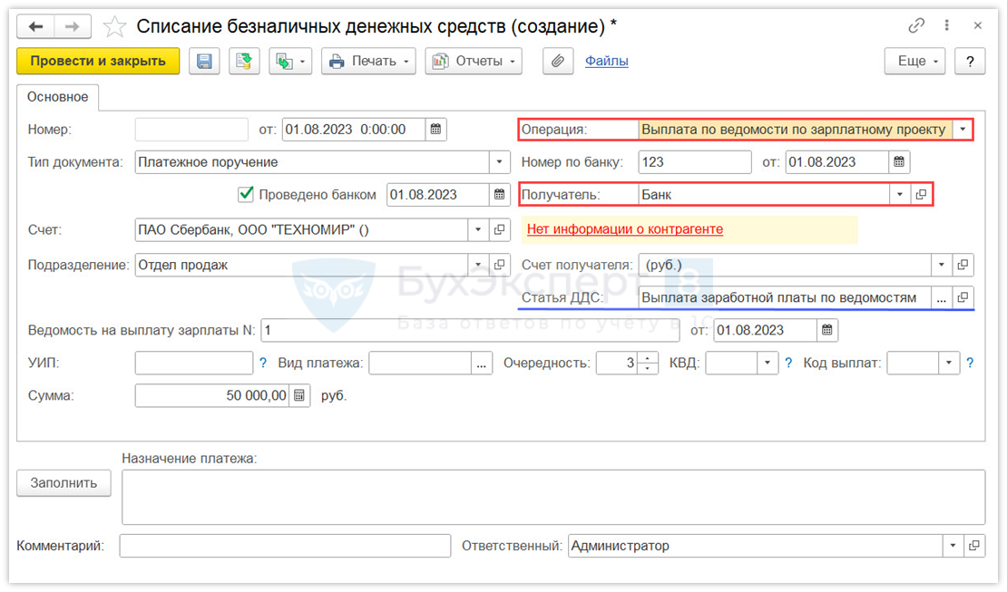 Для перечесления денежных средств на платежные карты сотрудников создайте документ Списание безналичных ДС с видом операции Выплата по ведомости по зарплатному проекту. В поле получатель укажите банк, обслуживающий платежные карты сотрудников. В поле сумма укажите общую сумму по документу и статью ДДС.