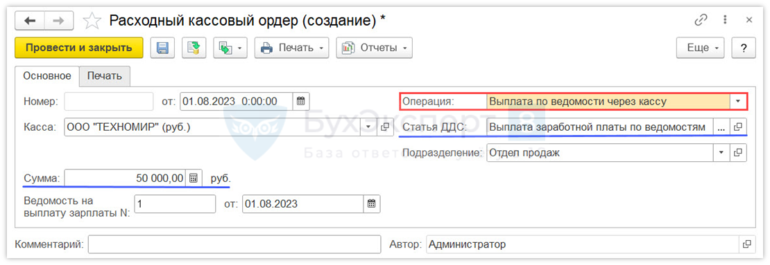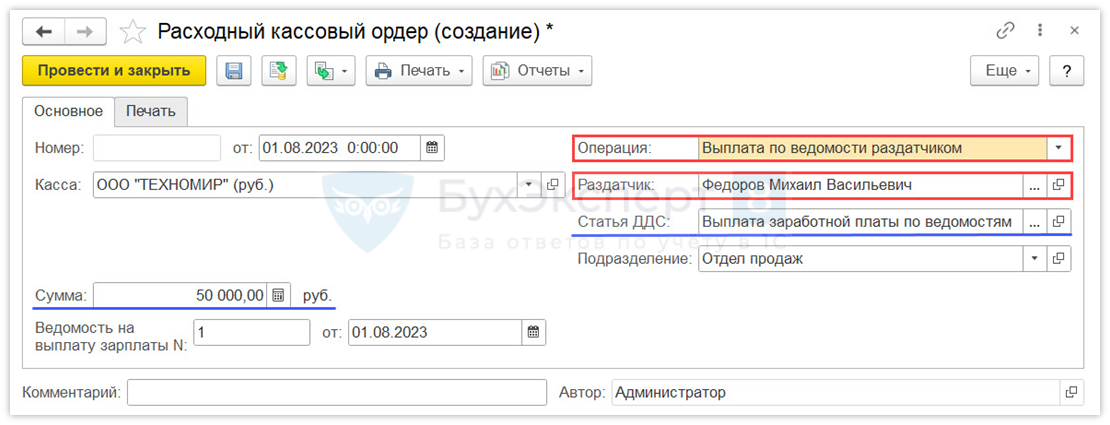 При выдаче заработной платы по ведомости раздатчиком, создайте Расходный кассовый ордер, с видом операции Выплата по ведомости раздатчиком. Укажите сотрудника, ответственного за выдачу заработной платы, статью ДДС и итоговую сумму по ведомости.