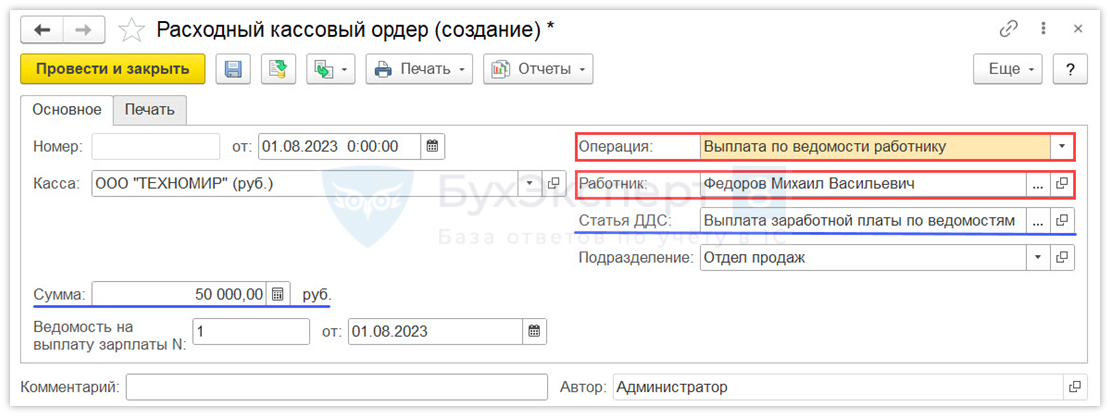 При выдаче заработной платы по ведомости кассиром создайте документ Расходный кассовый ордер с видом операции Выплата по ведомости через кассу. Укажите статью ДДС Выплата заработной платы по ведомостям и итоговую сумму по ведомости.