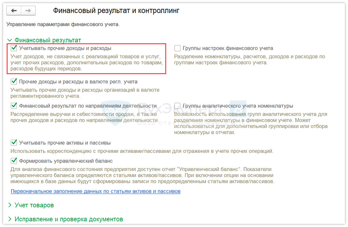 Включите в настройках функцию Учитывать прочие доходы и расходы. Перейдите в раздел НСИ и администрирование — Финансовый результат и контроллинг и установите флажок Учитывать прочие доходы и расходы.