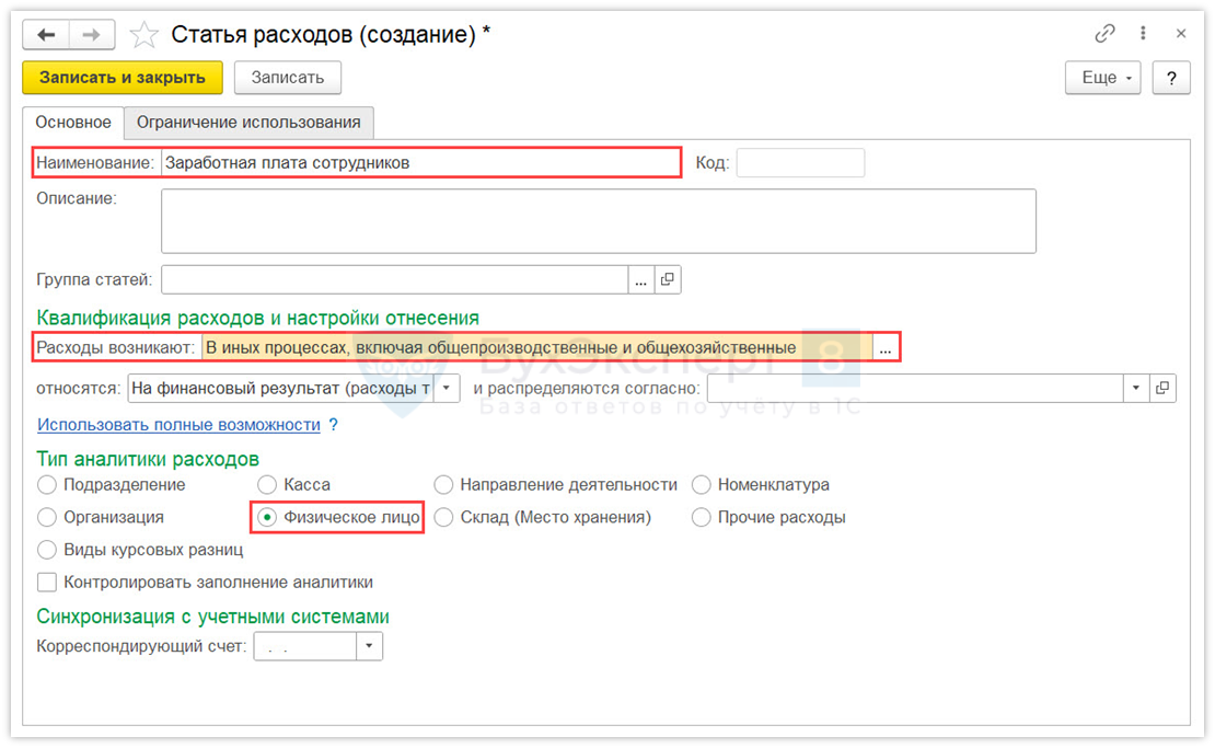 Перейдите в раздел Финансовый результат и контроллинг — Статьи расходов и создайте Статью расходов. При создании статьи укажите: