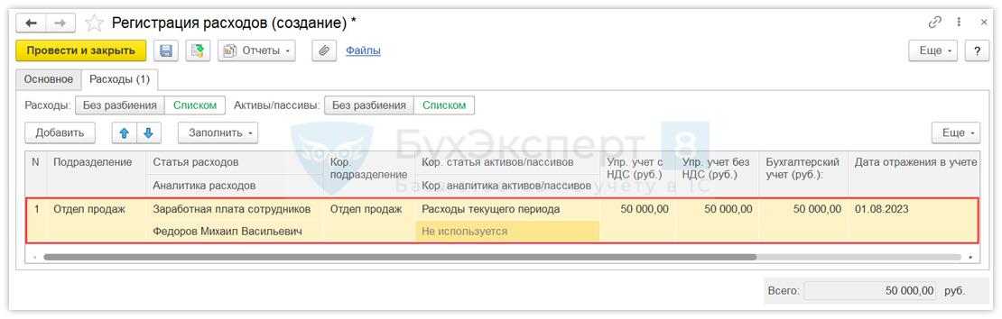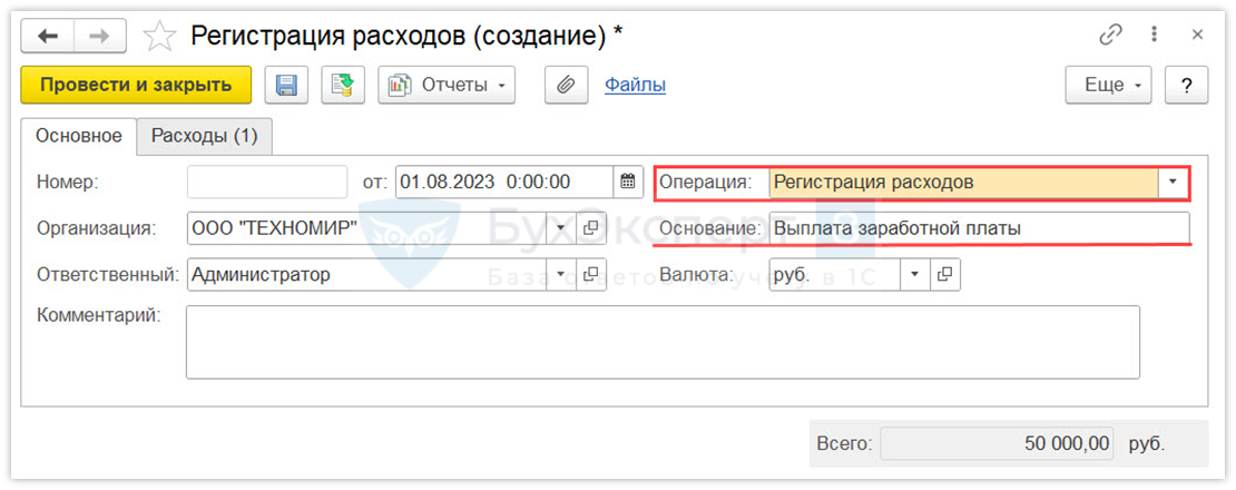 Создайте документ Регистрация расходов. На вкладке Основное укажите основание для регистрации расхода – выплата заработной платы.