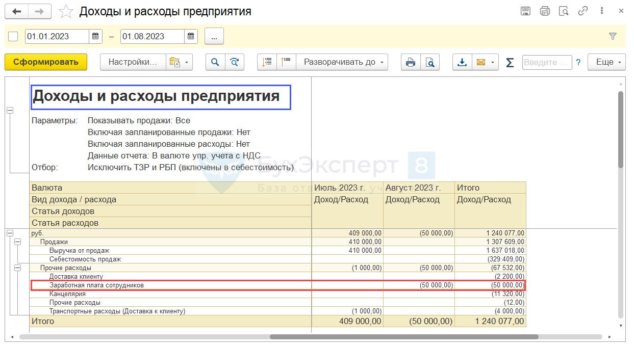 При анализе отчета Доходы и расходы предприятия можно увидеть расходы организации по оплате труда сотрудников.