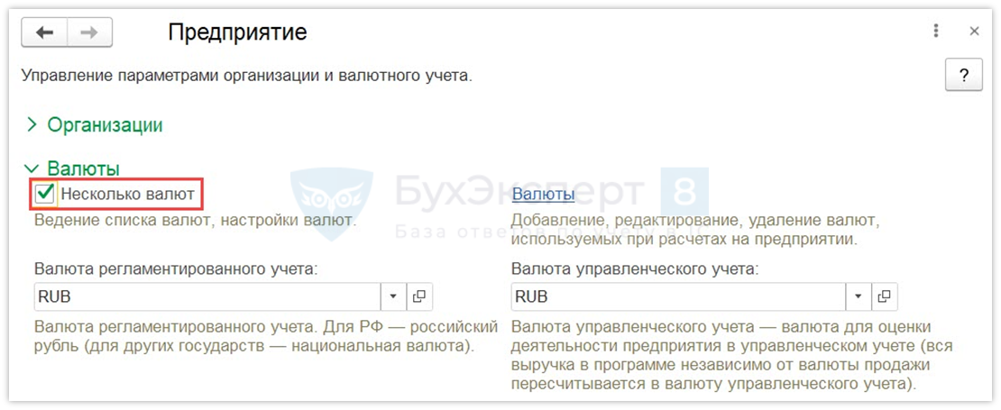 Перейдите в раздел НСИ и адмистрирование — Предприятие — Валюты. Установите флажок Несколько валют.