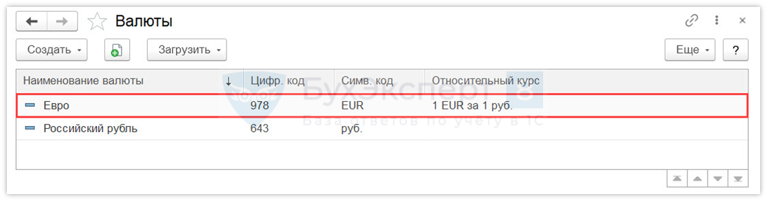 Теперь необходимо загрузить курс валют. Нажмите на кнопку Загрузить — Загрузить курсы валют.