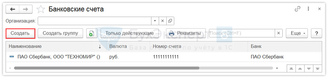 Перейдите в раздел НСИ и администрирование Банковские счета. Нажмите кнопку Создать.