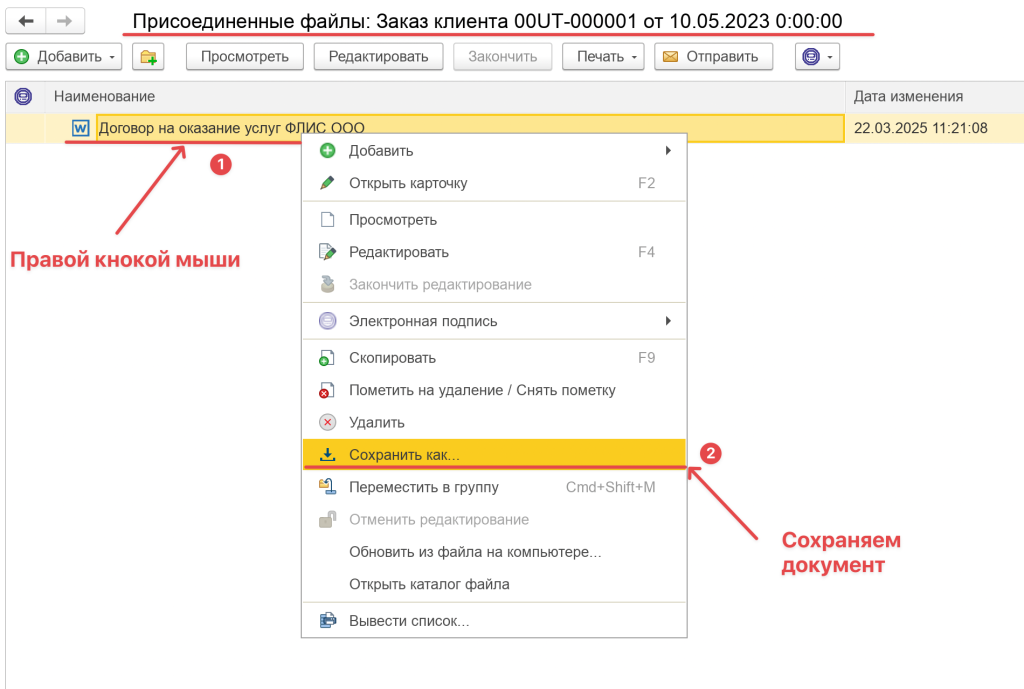 Здравствуйте Наталья. Чтобы выгрузить файл из документа Заказ клиенты необходимо перейти в данном документе на гиперссылку Файл и нажать на необходимом файле правой кнопкой мыши. Затем выбрать пункт меню Сохранить как. (скрин).