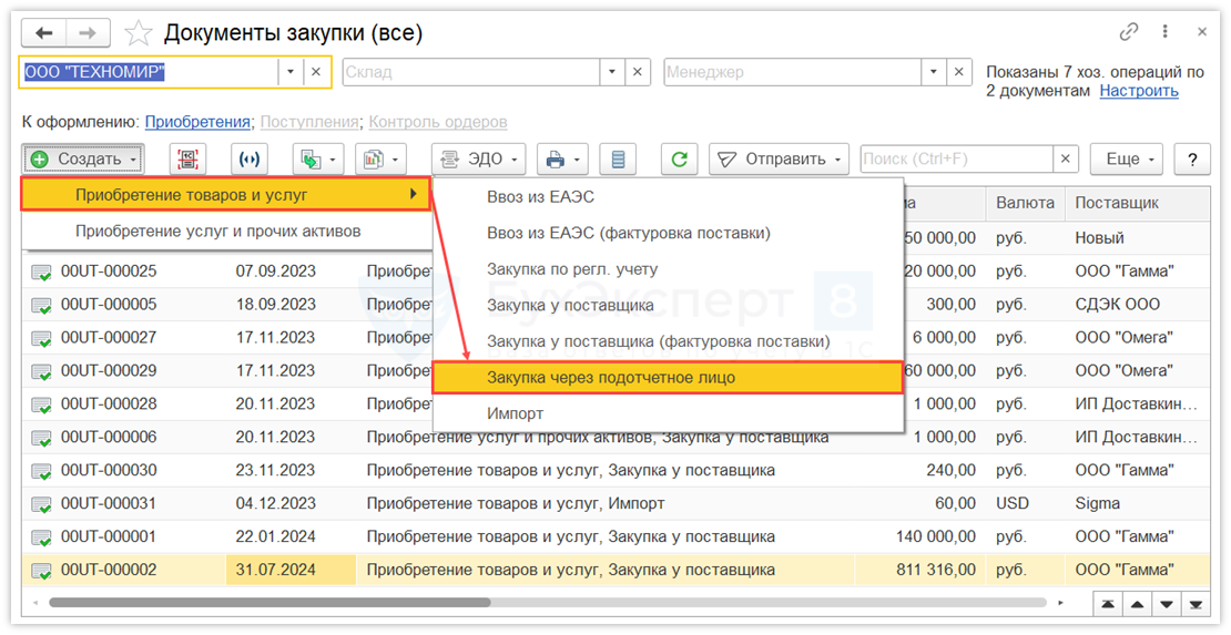 Перейдите в раздел Закупки – Документы закупки (все) и создайте новый документ Приобретение товаров и услуг с типом операции Закупка через подотчетное лицо.