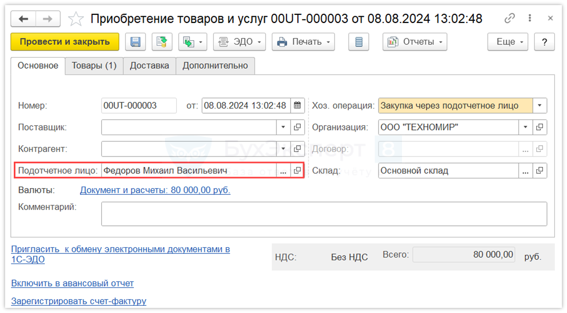 Оформление поступления товаров через подотчетное лицо