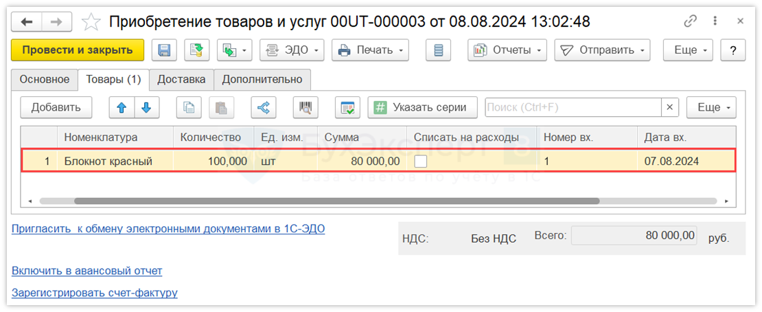 На вкладке Товары заполните информацию о приобретенном ТМЦ.