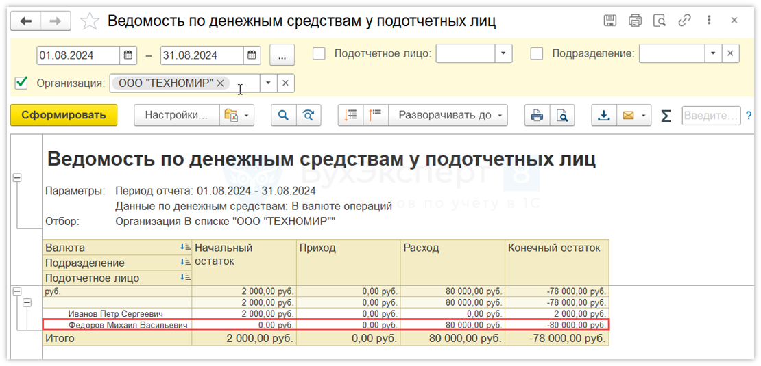 После проведения документа в отчете Ведомость по денежным средствам у подотчетных лиц будет отражен расход денежных средств подотчетным лицом.