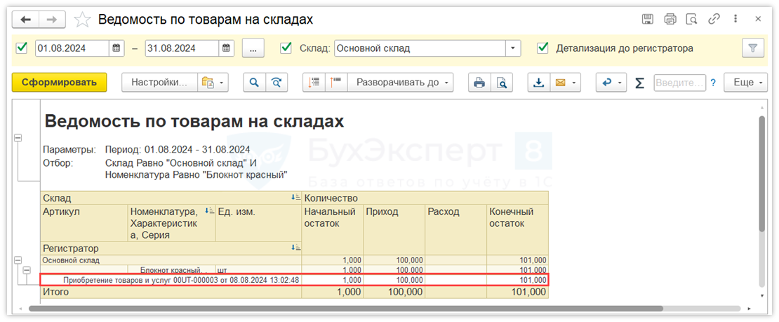 Приход ТМЦ можно проконтролировать при помощи отчета Ведомость по товарам на складах.