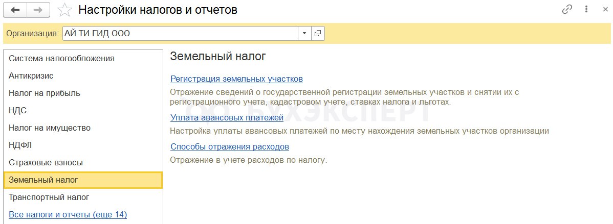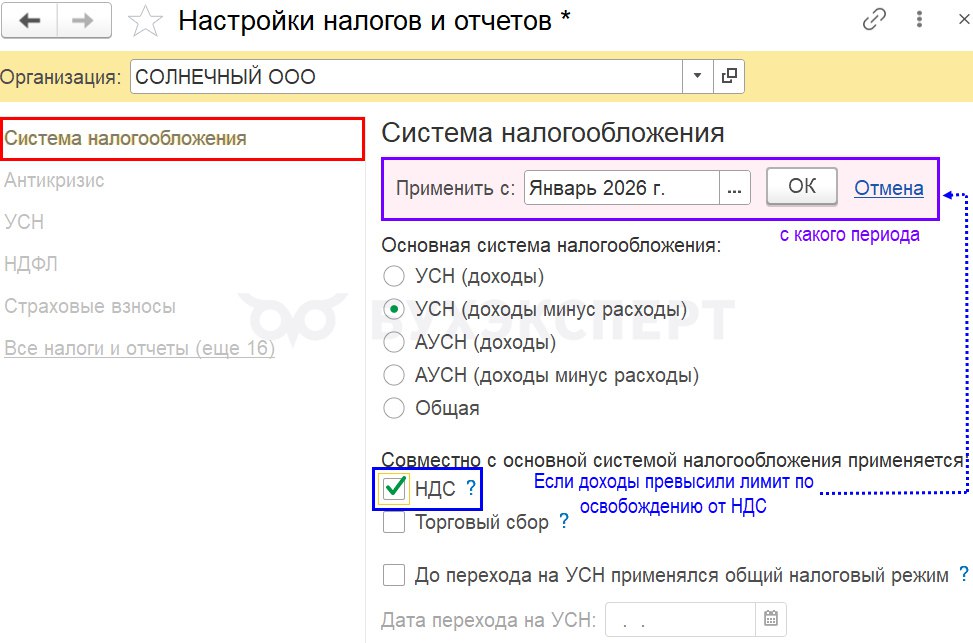Настройки по НДС находятся в разделе Главное — Налоги и отчеты — вкладка Система налогообложения.