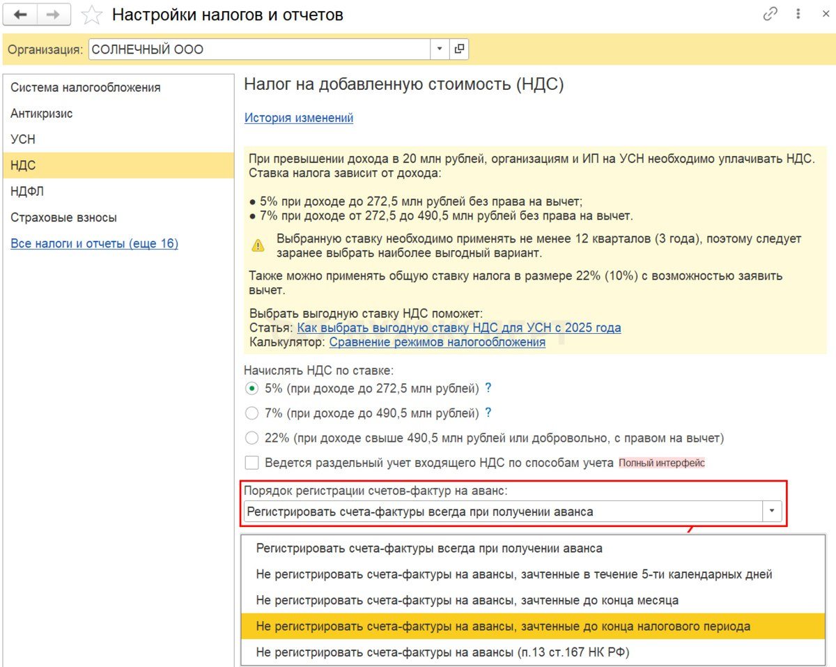 - Настройка учетной политики по НДС в 1С: авансовые счета-фактуры