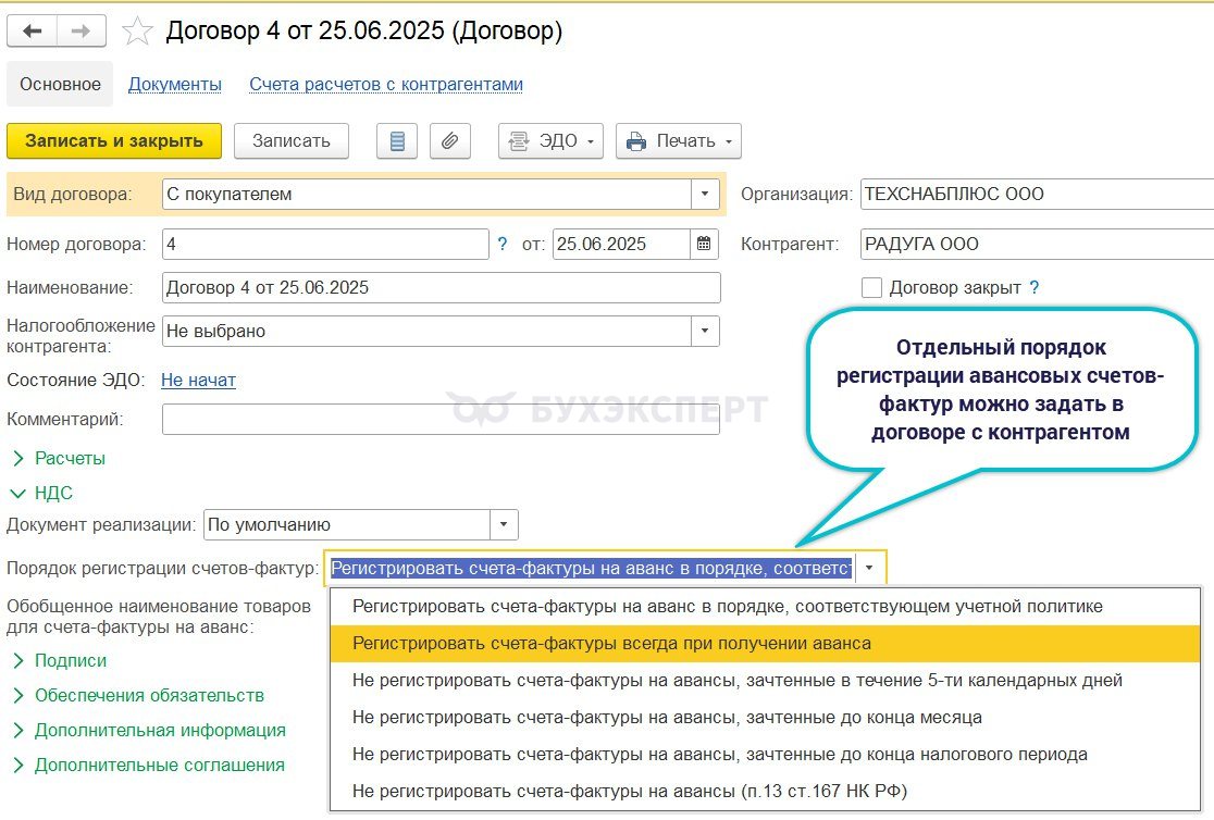 Отдельный порядок регистрации авансовых счетов-фактур можно задать в договоре с контрагентом.