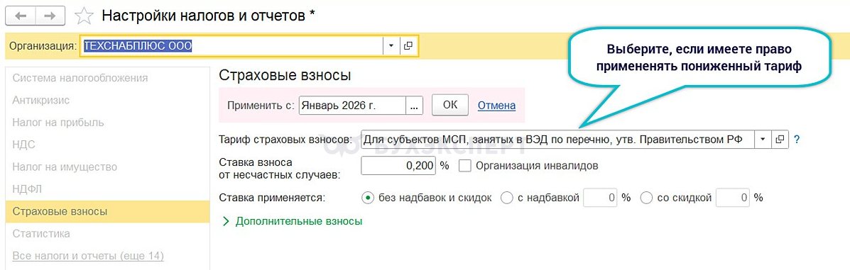В 1С выполните настройки учетной политики по НУ в разделе Главное — Налоги и отчеты вкладка Страховые взносы, выберите тариф Для субъектов МСП, занятых в ВЭД по перечню, утв. Правительством РФ.