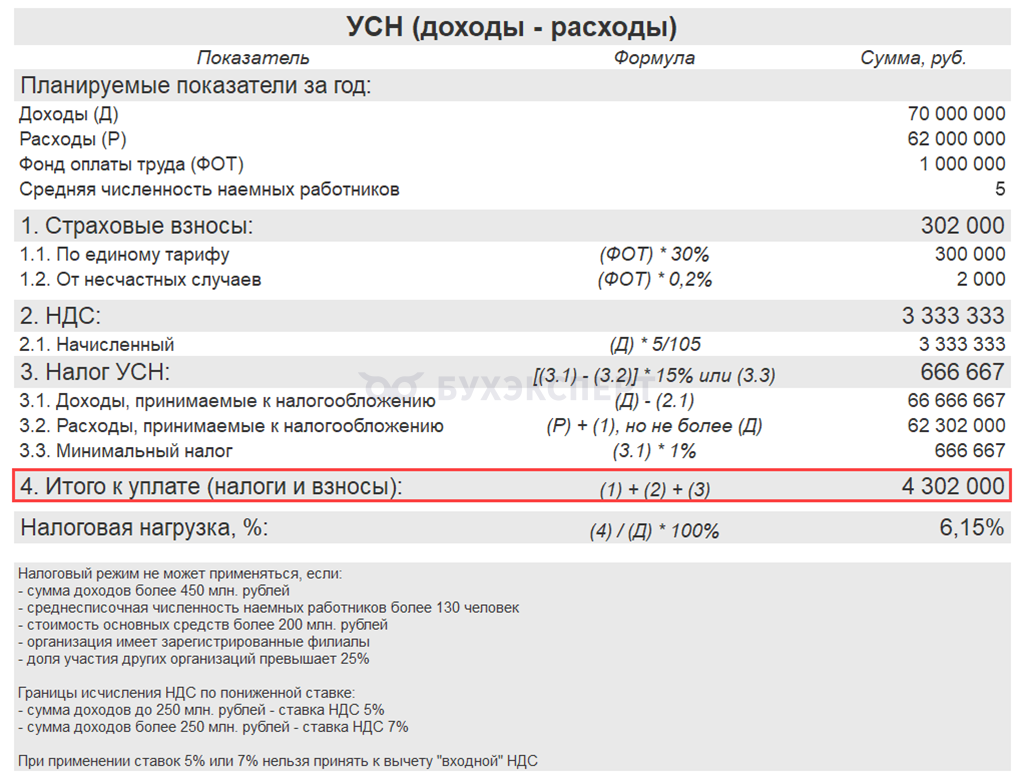 Если по каким-то причинам уплата минимального налога ожидается на протяжении длительного времени, то показатели в графе УСН 15% из таблицы замените на суммы минимального налога, рассчитанного по формуле: